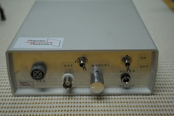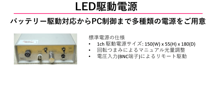 回転ダイヤルによるマニュアル式の光量設定およびアナログ電圧入力による強度変調対応 (BNC端子)