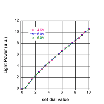 電源電圧を4.6V(充電式充電池), 5.0V(ACアダプタ), 6.0V(乾電池)と変化させても、LED発光光量(光パワーメーターで測定)は変化いたしません。