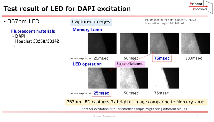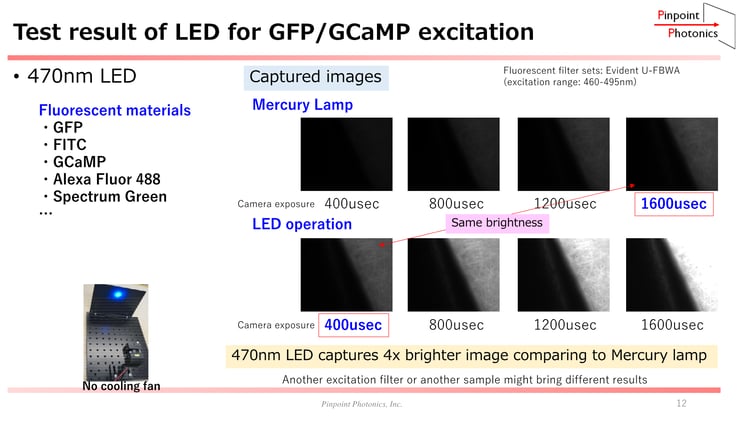 結果2:GFP領域においてはLED光源は水銀ランプ光源の 4x 程度の明るさでした。