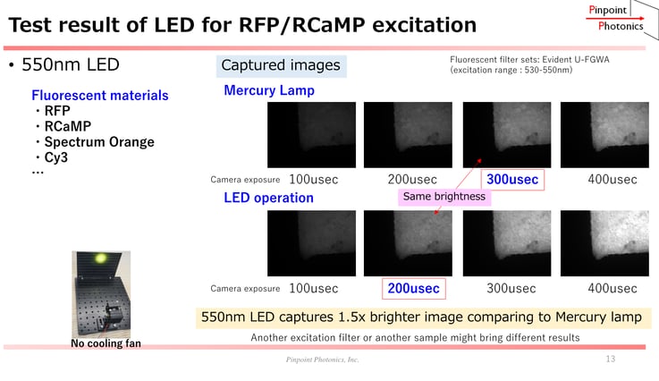結果3:RFP領域においてはLED光源は水銀ランプ光源の 1.5x程度の明るさでした。