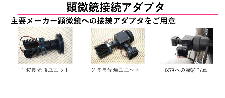 蛍光励起用LED光源は主要メーカーの顕微鏡への接続アダプタを用意しております。