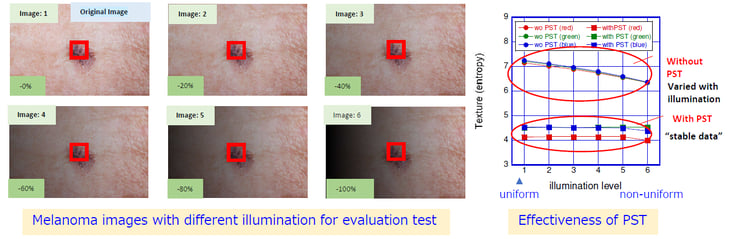 意図的に輝度を変化させた6つの画像において、テキスチャー(entoropy)を検出した結果、PST処理を行うことにより、安定したテキスチャー値が検出できることが解りました。・AI・機械学習を用いた画像解析を安定 (texture検出のばらつき低減)にします。
